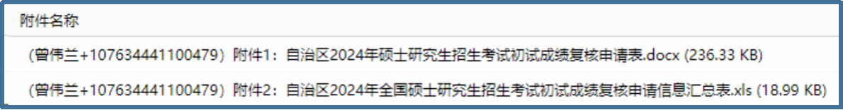 2.申请程序:硕士研究生成绩公布后,考生如需复核成绩,须按要求提出申请并如实填写《自治区2026年硕士研究生招生考试初试成绩复核申请表》(附件1)、《自治区2026年全国硕士研究生招生考试初试成绩复核申请信息汇总表》(附件2),以邮件形式发送至我校研究生处招生办公室官方邮箱(ksdxyjsczs@ksu.edu.cn),邮件主题及附件文件夹须注明考生编号及考生姓名(例如107635652502299+张三 申请复核成绩),附件1命名为“张三+10763…2299+附件1:XX申请表”,附件2命名为“张三+10763…2299+附件2:XX汇总表”,如图所示: